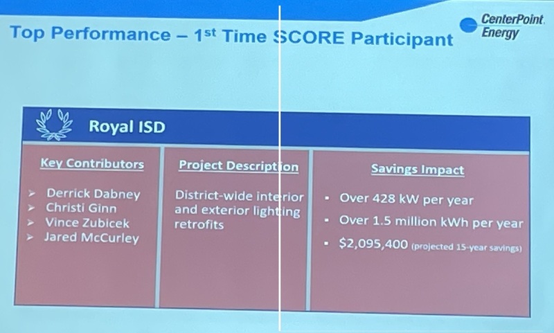 Royal has been enrolled in the program since March 2022 and is projected to produce over $1.7 million in energy savings over the next 15 years. E3 originally estimated around $116,000 in annual utility savings to Royal ISD when we proposed the project at the beginning of last year. This includes all of the lighting, HVAC, and controls work in the project. This is an annual savings number, so Royal ISD should see this benefit for 10-15 years.