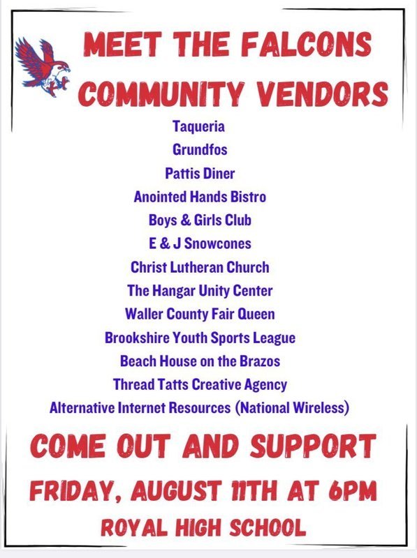 I am grateful for the outstanding turnout from the community at our Meet the Falcons event. The pep rally highlighting both Fall and Spring sports, our wonderful Fine Arts Department along with our clubs and organizations were some of the highlights from Friday night. I would like to give a special thanks to all of the community business partners that participated as well. Please click here to view all event pictures!