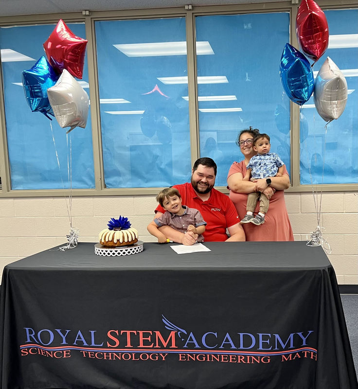 He was joined on signing day by his wife, Falcon Veronica Webb, their children, STEM Principal Katelyn Miksch, Royal Director of Teaching and Learning Phylicia Glover, STEM PLTW teacher Ana Lopez, and Dr. Hill Jackson from Prairie View A&M for the signing of his teacher contact. Congratulations, Mr. Webb! We look forward to great things from you as you lead our students and invest in our tomorrow! #WeAreRoyal