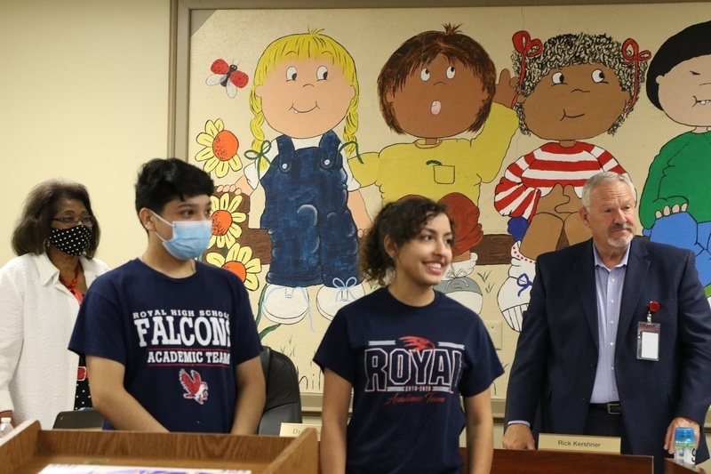 The team and their coaches were honored at the April 11 Royal School Board meeting. The team presented a tribute to their Academic UIL coach, Dawn Richardson. Seniors Alexis Ibarra and Melani Alanis presented school board trustee Nathaniel Richardson with a gift for Mrs. Richardson as a token of their appreciation from the entire team. Superintendent Rick Kershner, Board Member Nathaniel Richardson, and Board Member Elton Foster also expressed thanks for her contributions. Mrs. Richardson is the heart of Royal High School, and is heavily involved with our students. Royal ISD cannot thank her enough for her commitment to and love for our Falcon students.