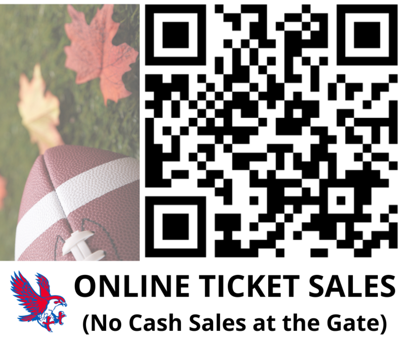 Scan the QR code or visit https://www.royal-isd.net/page/athletics to purchase tickets for tonight's varsity football game against Houston Worthing at Falcon Stadium. No cash sales will be available at the gate. Let's go, Falcons! #WeAreRoyal