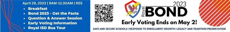 Royal community members are invited to enjoy breakfast, learn about Royal ISD Bond 2023, and register to vote! Participants will be treated to a bus tour of Royal ISD to view firsthand the new communities that are coming to Royal! Tours will take approximately one hour. Click here to become a partner!