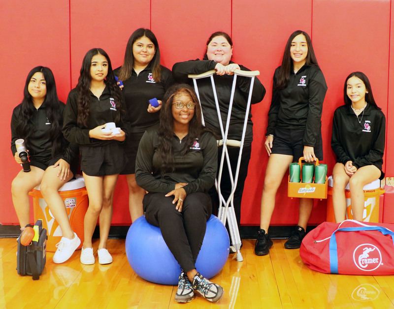 The sports medicine team is made up of Ms. Rosas (Head AT), Totiana Kay (Senior), Leslie Gomez (Junior), Shamari Moss (Junior), Kyla Thomas (Junior), Victoria Gonzalez (Sophomore), Gabby Diaz (Freshman), Liset Interiano (Freshman), and Esteban Carranza (Freshman).