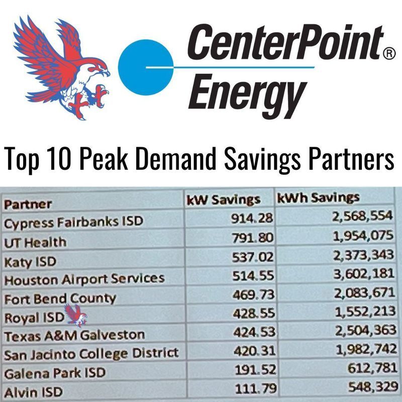 Falcon team members Christi Ginn and Derrick Dabney were invited to join Centerpoint Energy at their February 2023 SCORE/CitySmart kickoff luncheon at Maggianoβs Little Italy. Royal ISD was presented with a 2022 βTop Performerβ award and was listed in 6th place on the Top 10 for peak demand savings. Also in attendance were representatives from E3, who is partnering with Royal on the lighting and HVAC upgrades across the district.