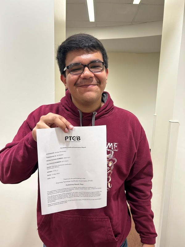 Students celebrated Nicholas Hernandez passing his Pharmacy Technician Certification through Pharmacy Technician Certification Board (PCTB).