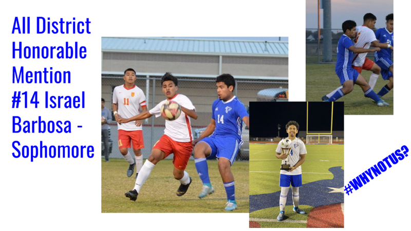Here are the members of the Falcon Men's Soccer Team who have earned All-District Honors. These boys have worked hard and it paid off! We finished the season with a 21-2-2 record and held a 21 game undefeated streak. We won the Madisonville tournament in the process and came in 3rd in a very tight district race. Coach Perez, Coach Floyd, and Coach Gale are extremely proud of them and look forward to the day we share the field again. Click here for a PDF file of all images.