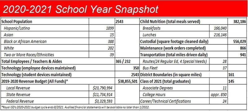 In many school districts, growth primarily comes from new home sales. In Royal, however, business growth combined with the growing population within the Royal ISD boundaries puts the school district in a unique position to provide expanded opportunities and additional facilities for current and future Falcon students. In the space of one year, Royal ISDβs tax base increased from $1.45 billion (November 2020) to $2.10 billion (November 2021), allowing the district to support a nearly $100 million bond with no tax rate increase. Smart, strategic financial management and a recent bond refunding (which saved 2 years and $2,651,131) further solidifies the districtβs strong financial standing.