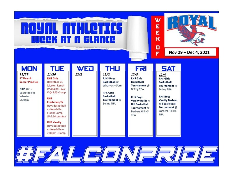 - RHS boys basketball, Needville @ Royal, F-4:30-Comp, JV-5:30 pm-Aux, V 7pm-Comp