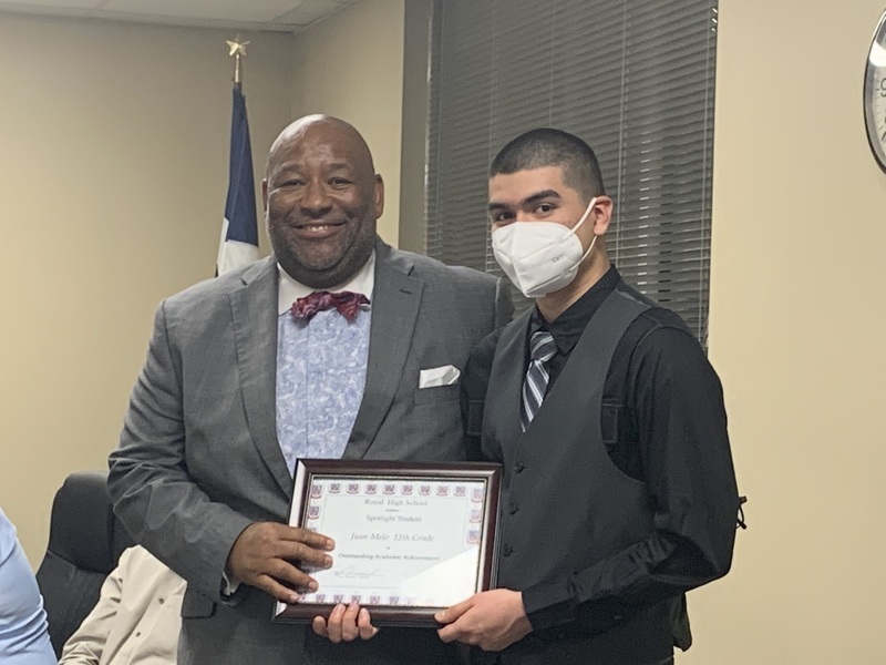 Royal High School Principal Tony Runnels presented Falcon senior Juan Mello with the Outstanding Academic Achievement award, stating that Juan grew from a shy student who did not want to come to school into an an involved and outstanding student. In addition to being on the honor role, Juan achieved mastery level scores on his End-of-Course exams and is active in the ROTC program. Congratulations, Juan! We cannot wait to see where life takes you!