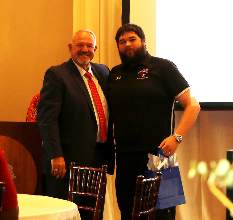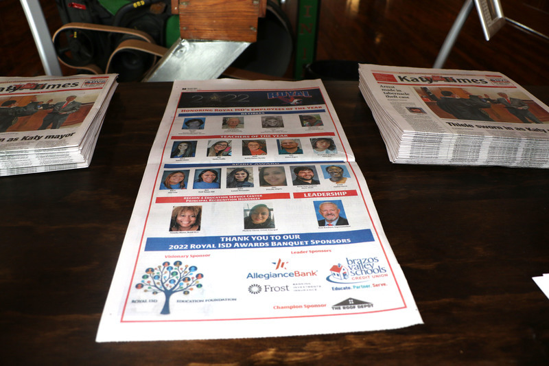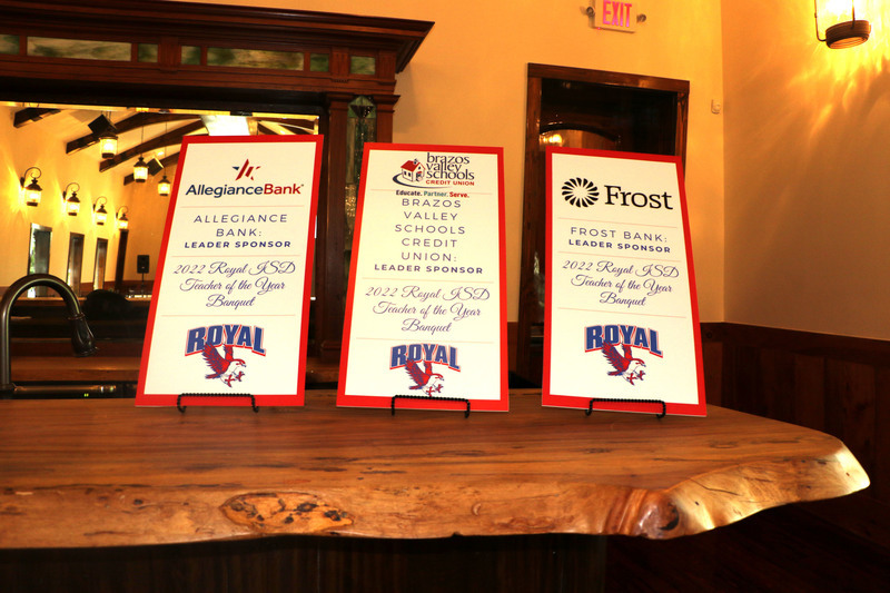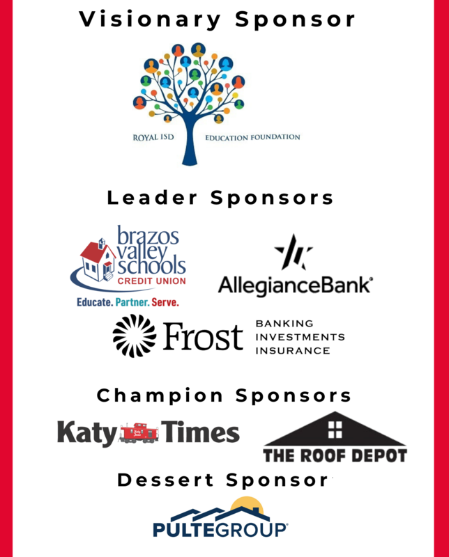 Royal thanks each of our sponsors for their support of Royal ISD and Texas public schools, which remain the best choice for educating our children. This event would not have been possible without their assistance. Royal Education Foundation is our Visionary sponsor, with a donation of $1000. Leader sponsors Allegiance Bank, Brazos Valley Schools Credit Union, and Frost Bank each donated $500. Champion sponsors The Katy Times and The Roof Depot each donated $250. Gift items were provided by several organizations. Adriatic CafΓ© provided food items, Brazos Valley Schools Credit Union provided $50 gift cards and wallets for our Teachers of the Year, and the West-I-10 Chamber of Commerce provided $50 gift cards for our Spirit Award winners. The Katy Times published a full page ad dedicated to our award recipients, along with a copy of the issue for all event attendees. Pulte Group provided desserts for the event.