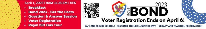Royal community members are invited to enjoy breakfast, learn about Royal ISD Bond 2023, and register to vote! Participants will be treated to a bus tour of Royal ISD to view firsthand the new communities that are coming to Royal! Tours will take approximately one hour. Click here to become a partner!