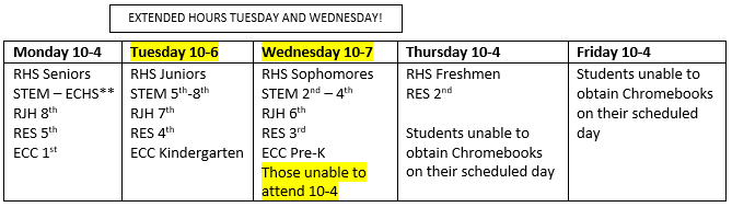5) Please go to your child's campus to check out a Chromebook according to the following schedule. If you were unable to pick up a Chromebook at the scheduled time, please visit your child's campus during the extended Wednesday hours, or any time on Thursday or Friday.