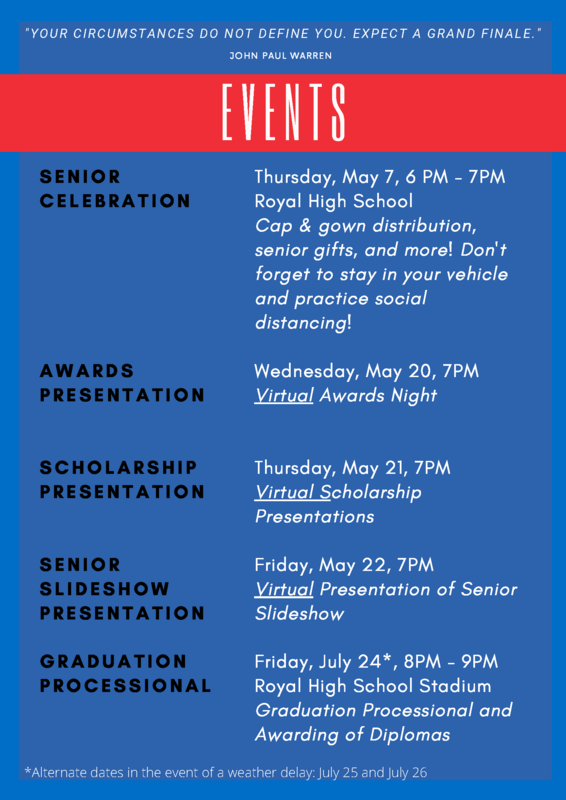 Attention Royal Community! We are excited to celebrate the Class of 2020 next week! The awards ceremony (for all grades) will take be shared on Wednesday, May 20 at 7pm. On Thursday, May 21 at 7pm, we will honor our scholarship recipients. On Friday, May 22, Royal will host a virtual graduation complete with faculty and administrator speeches, speeches by class officers and honor graduates, and more! Our in-person graduation will occur July 24 at Falcon Stadium, so mark your calendars! Please watch your email and the district website in the coming days for complete details related to each event. Congratulations, Royal Falcon Class of 2020!
