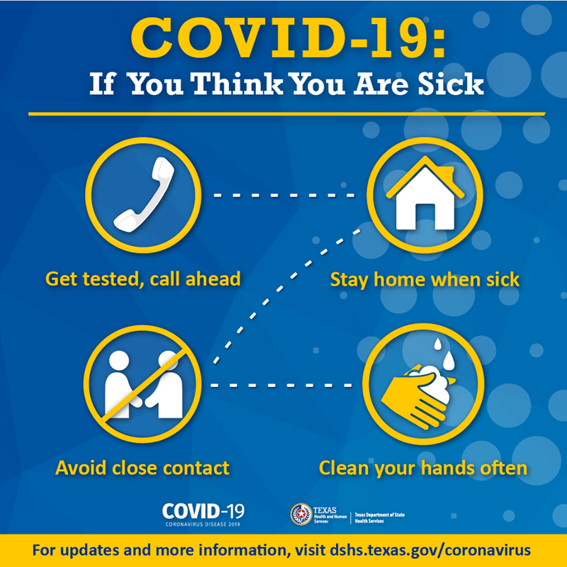 Please continue to practice CDC guidelines for preventing the spread of COVID-19. The following resources contain up-to-date information and guidance from Texas Department of State Health Services (DSHS):