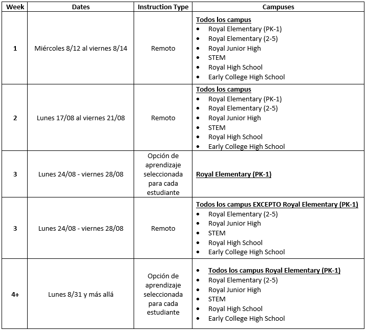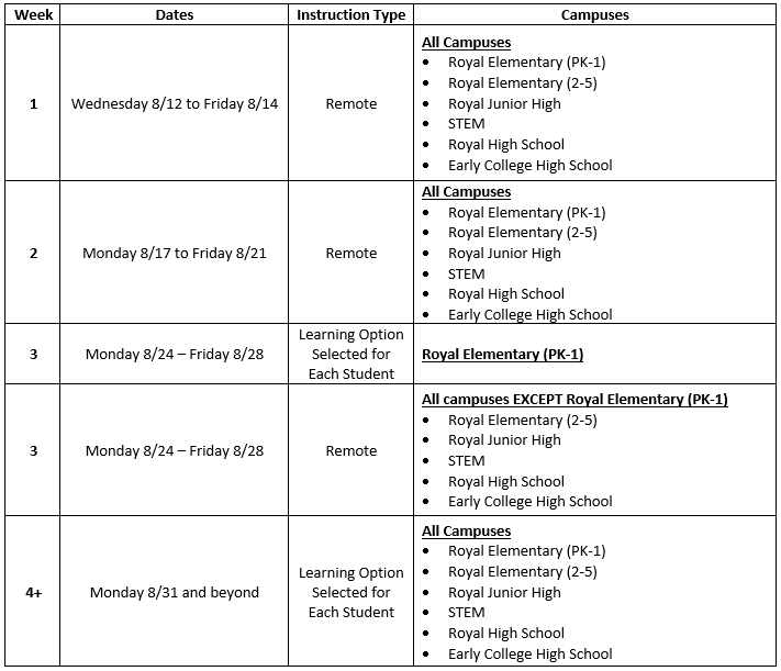 Royal ISD is strongly committed to ensuring student, staff, and community safety. As you know, COVID-19 cases have risen dramatically in recent weeks. As a result, Royal ISD has put into place remote learning for the first three weeks of the 2020-2021 school year (see schedule below).