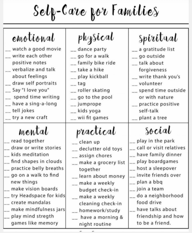 Self-care can be practiced with your family as well! Use this time to make memories with your family while practicing social distancing. Try to get outside to enjoy nature and maintain mental health! Visit healthychildren.org to access great ways to get outside while staying safe.