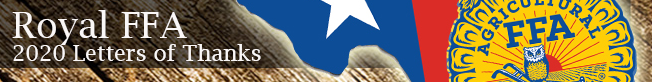 Students will be fulfilling their final obligation to receive funds earned through the Pledge Drive by writing and sending Letters of Thanks to those who purchased, as well as added-on to their livestock and horticulture projects. Royal ISD-CTE AgScience staff are personally contacting their students by telephone and via email this week with instructions and contact information for their letters.