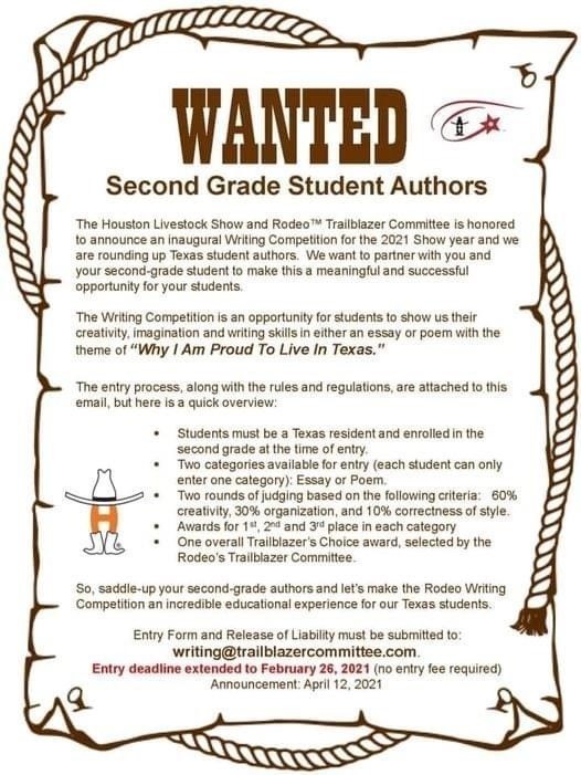 The Houston Livestock Show and Rodeo Trailblazer Committee invites all Texas second graders to participate in the inaugural Writing Competition for the 2021 Show year!