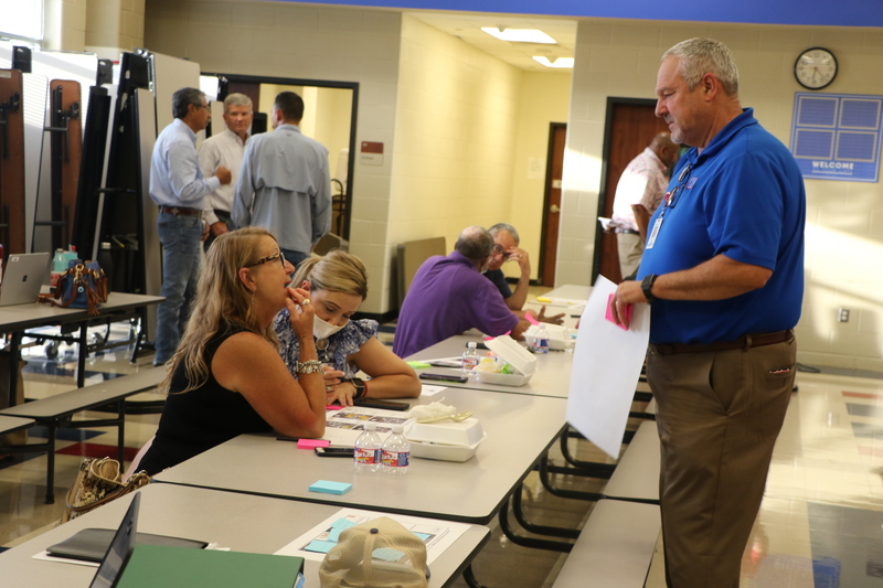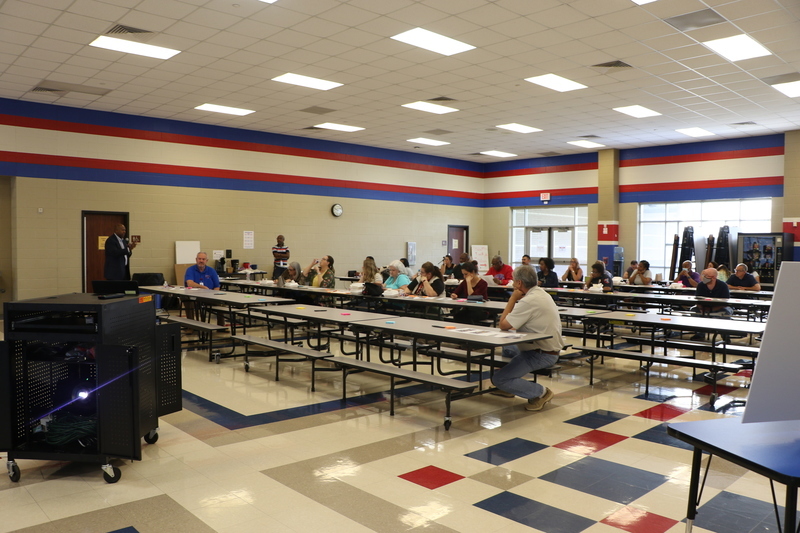 Kimberly Bow, Michael Lovaglio, and Scott Klaus from Stantec led meeting attendees in an activity that allowed them to vote and provide feedback on several district facility improvement options.