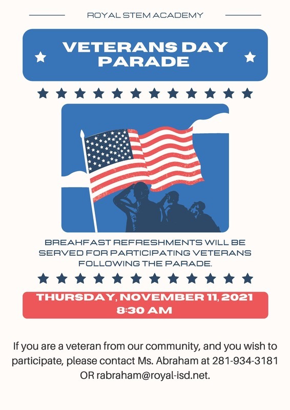Please join Royal STEM Academy in honoring our veterans at 8:30AM on Thursday, November 11, 2021. Click here to access the event flyer.
